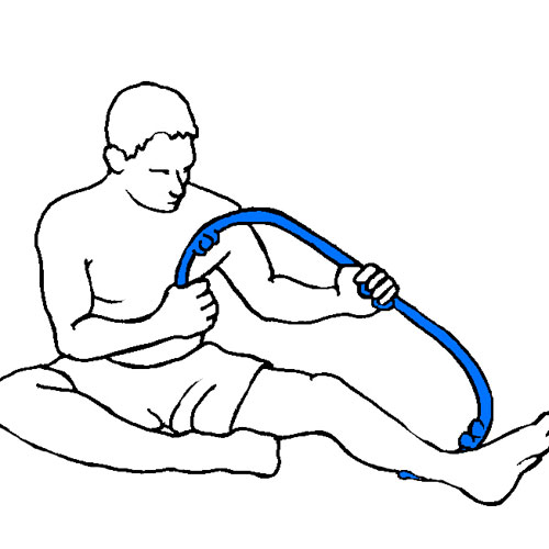Sit with the bi-knobs or tri-knobs under your foot. Push your foot downward on the knobs until the desired pressure is attained. Rotate the Myotool™ by alternately moving one hand forward and one backward.