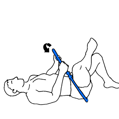 Lie on your back. Cross the ankle over the bent knee of the opposite leg. Position an end knob on the front of your hip or thigh. Slide the Myotool downward using the opposite heel on the floor. Further guide and direct the pressure with your hands.