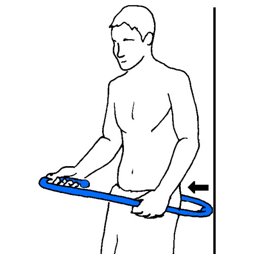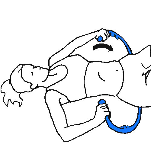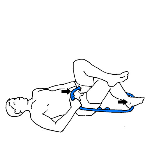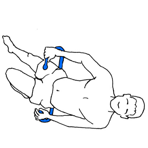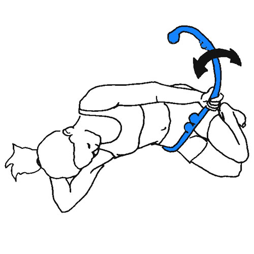 If your hips are narrow, you may be able to lie on your side with the Myotool hooked around you. Rock the bi-knobs or tri-knobs under the outer side of your buttocks.