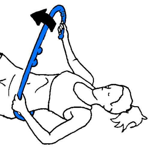 Lie on your back and slide an end knob past your spine to the muscles on the opposite side. Raise the free end of the Myotool™ up toward the ceiling and feel the end knob press upward next to your spine. Sustain the pressure or use a rocking motion.